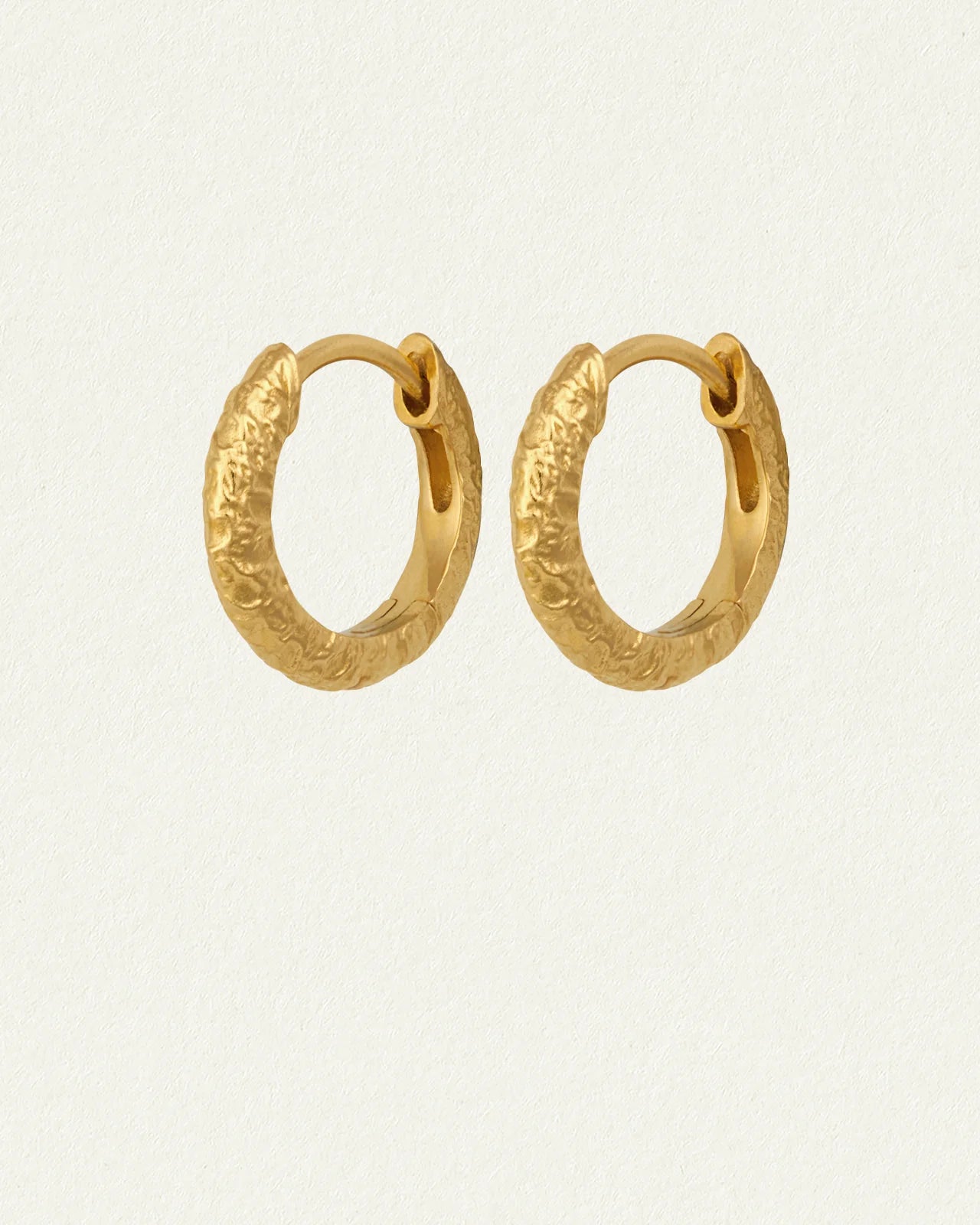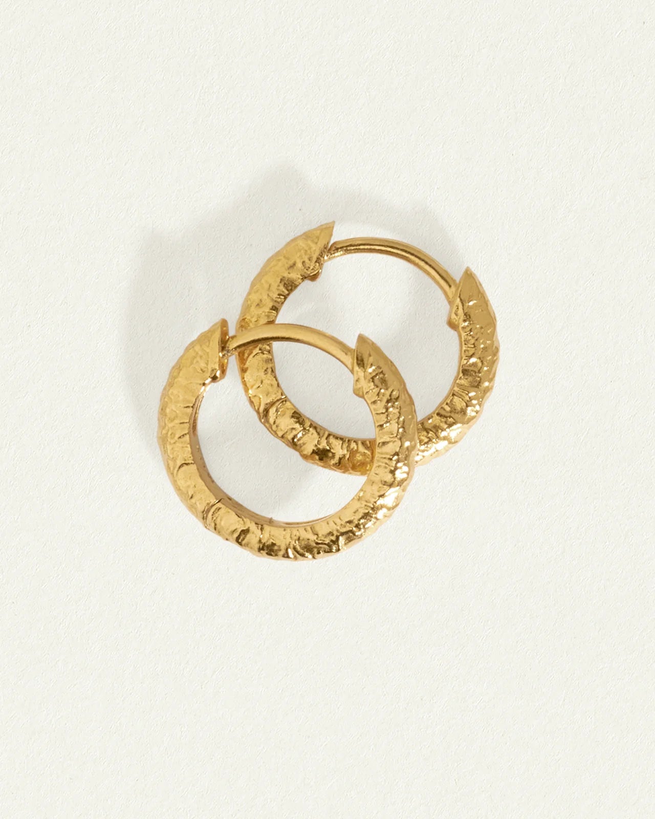 These 18k gold vermeil small hoop earrings capture the essence of molten lava. Their richly textured surface and compact size make them perfect for stacking.