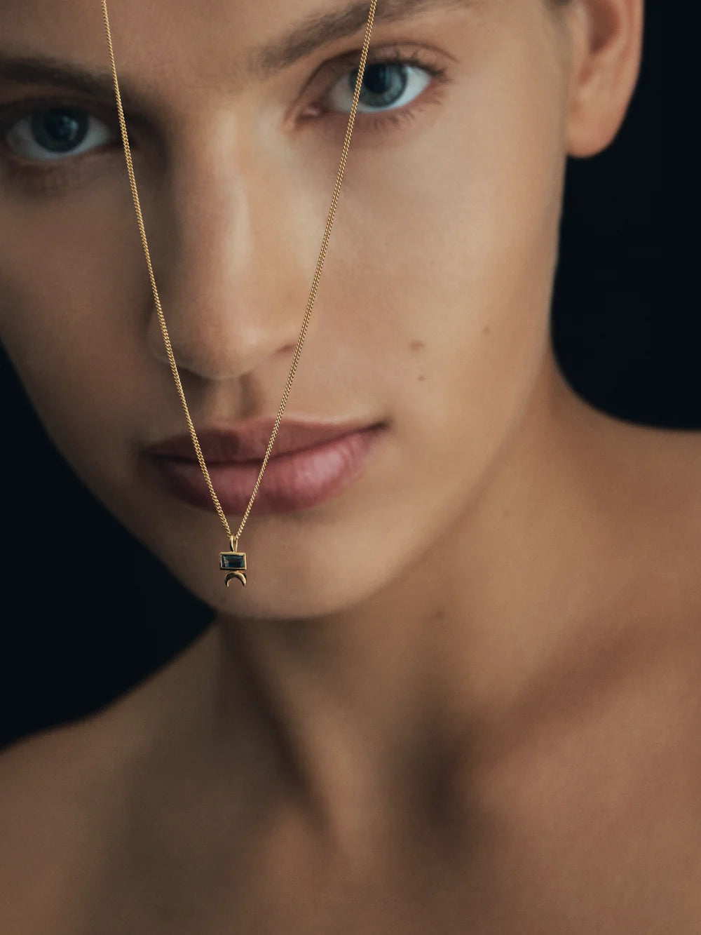 Meaning 'blessing,' the Nima Necklace is a delicate piece crafted from 18k gold vermeil. This fine necklace features a petite crescent moon pendant suspended from a single curb chain. A baguette-cut London blue topaz rests above, a stone historically linked to friendship and open communication.