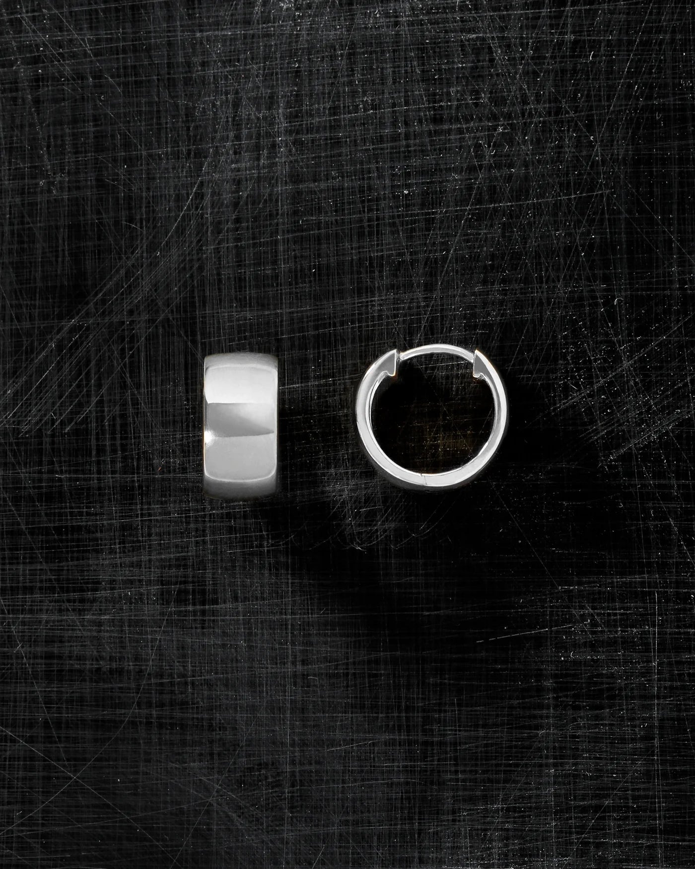 Bold and contemporary, the recycled sterling silver Nyla Hoops are wide huggies with a polished finish, perfect for sculptural stacking.