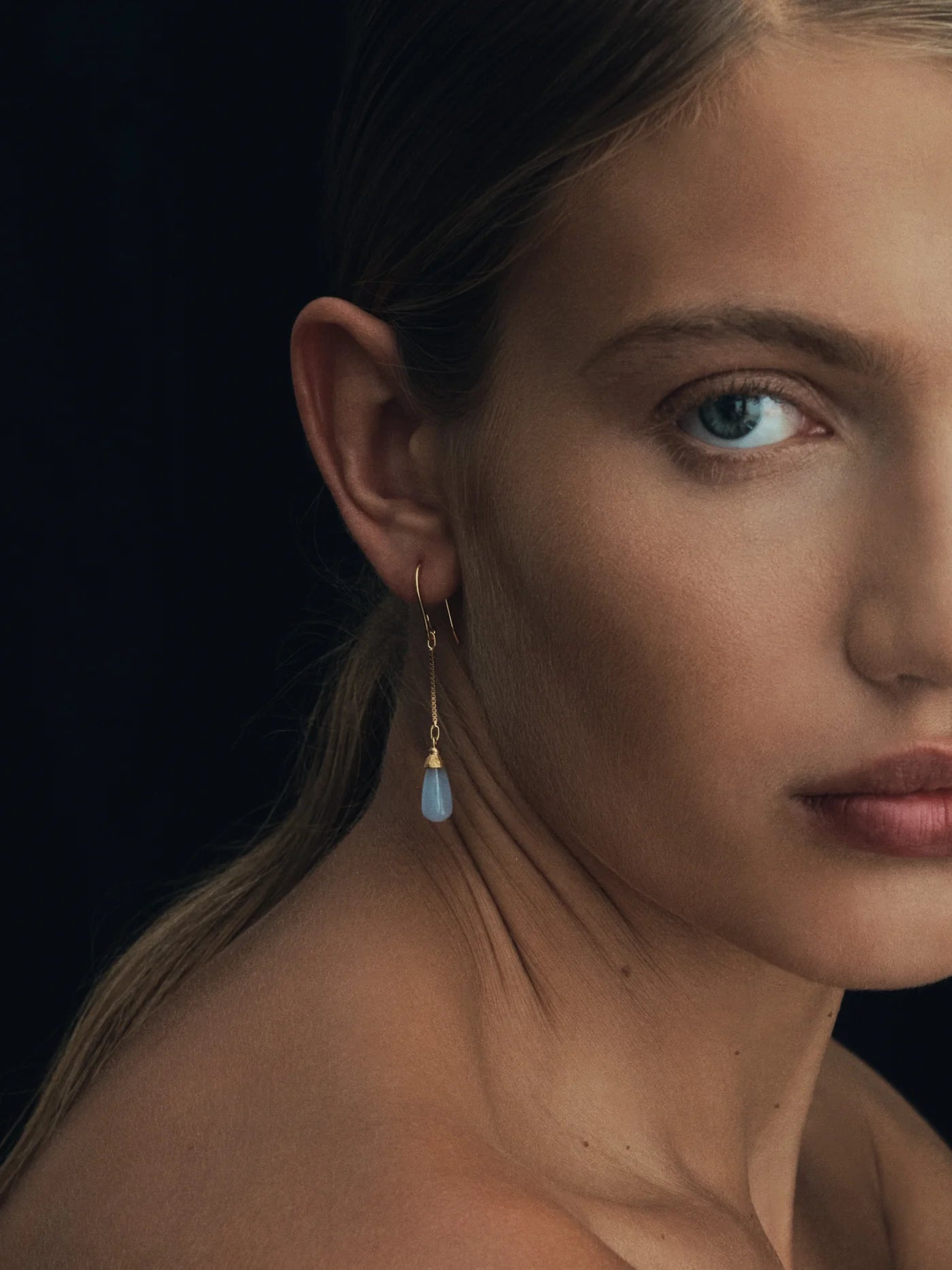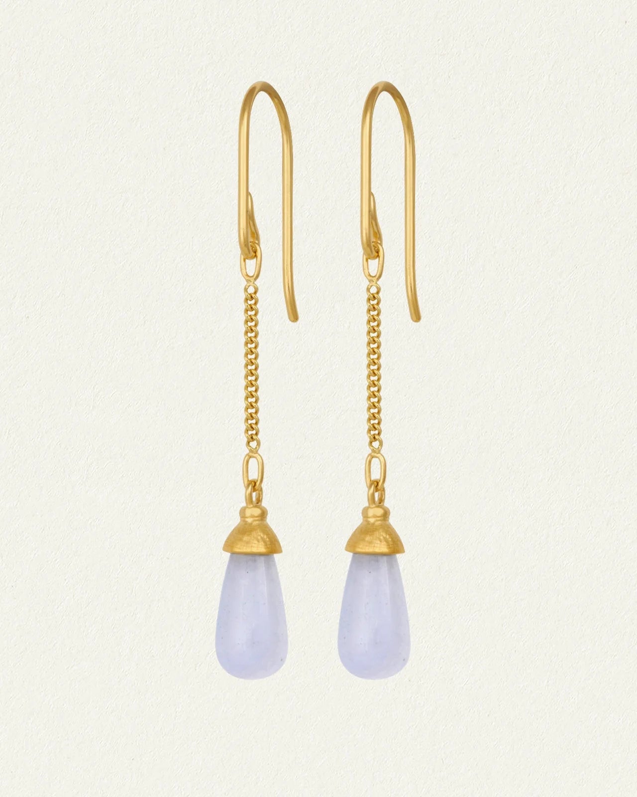 Crafted from 18k gold vermeil, the Opi Earrings feature blue lace agate drops, suspended from fine chains and secured with hook fastenings.