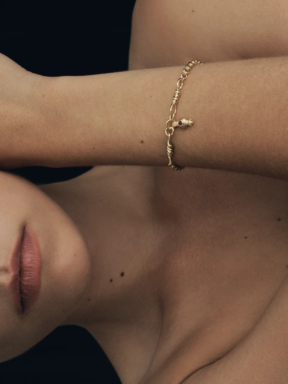 The Pomegranate Bracelet, crafted from 18k gold vermeil, is anchored by a pomegranate charm—a timeless symbol of abundance. Paired with a fiery ruby, long associated with love and passion, it invites you to manifest your heart's desires.
