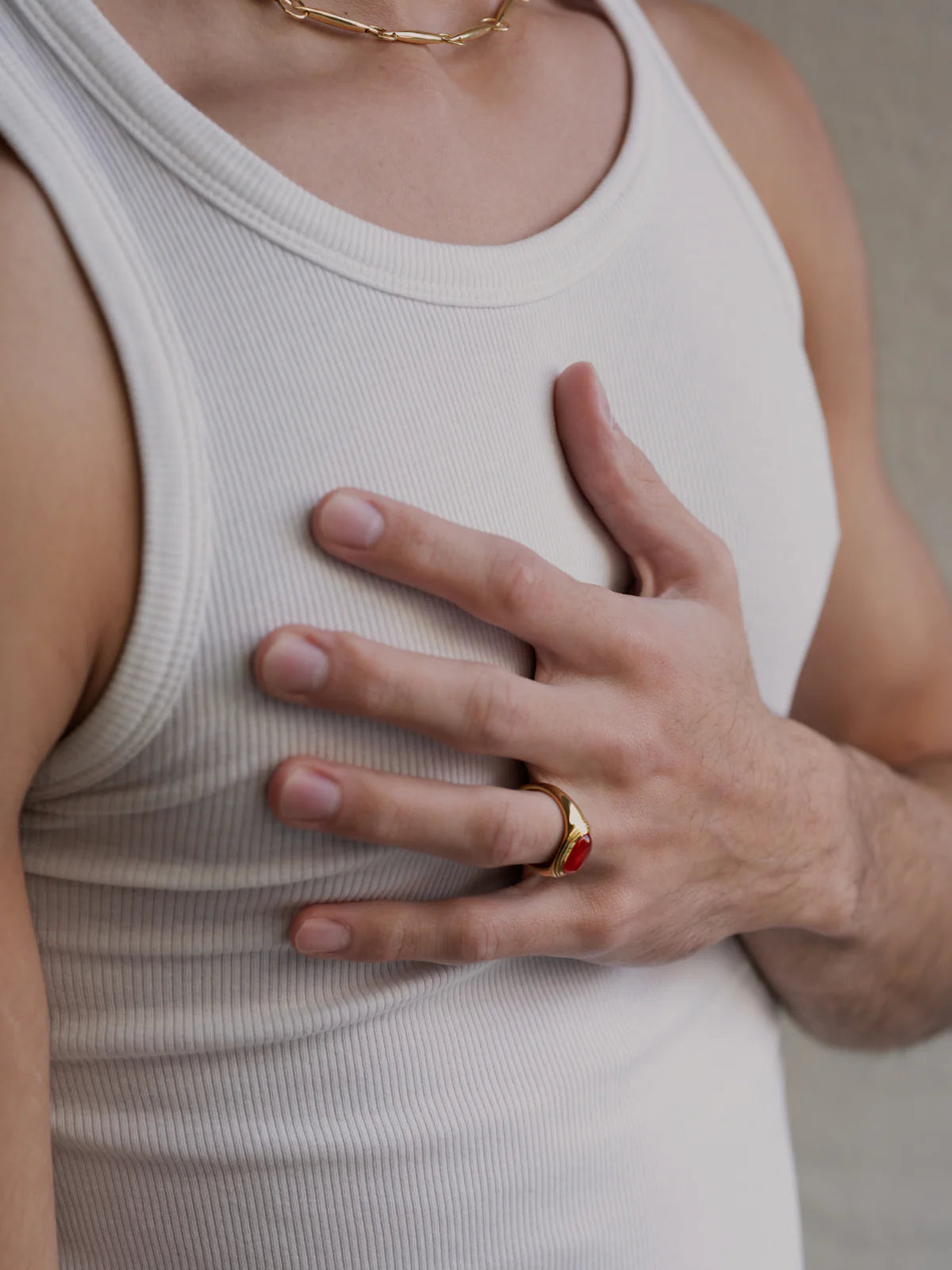 Inspired by ancient Roman jewellery, the Pompeii Ring is an 18k gold vermeil dome ring showcasing an oval carnelian cabochon, associated with vitality, courage, and protection.