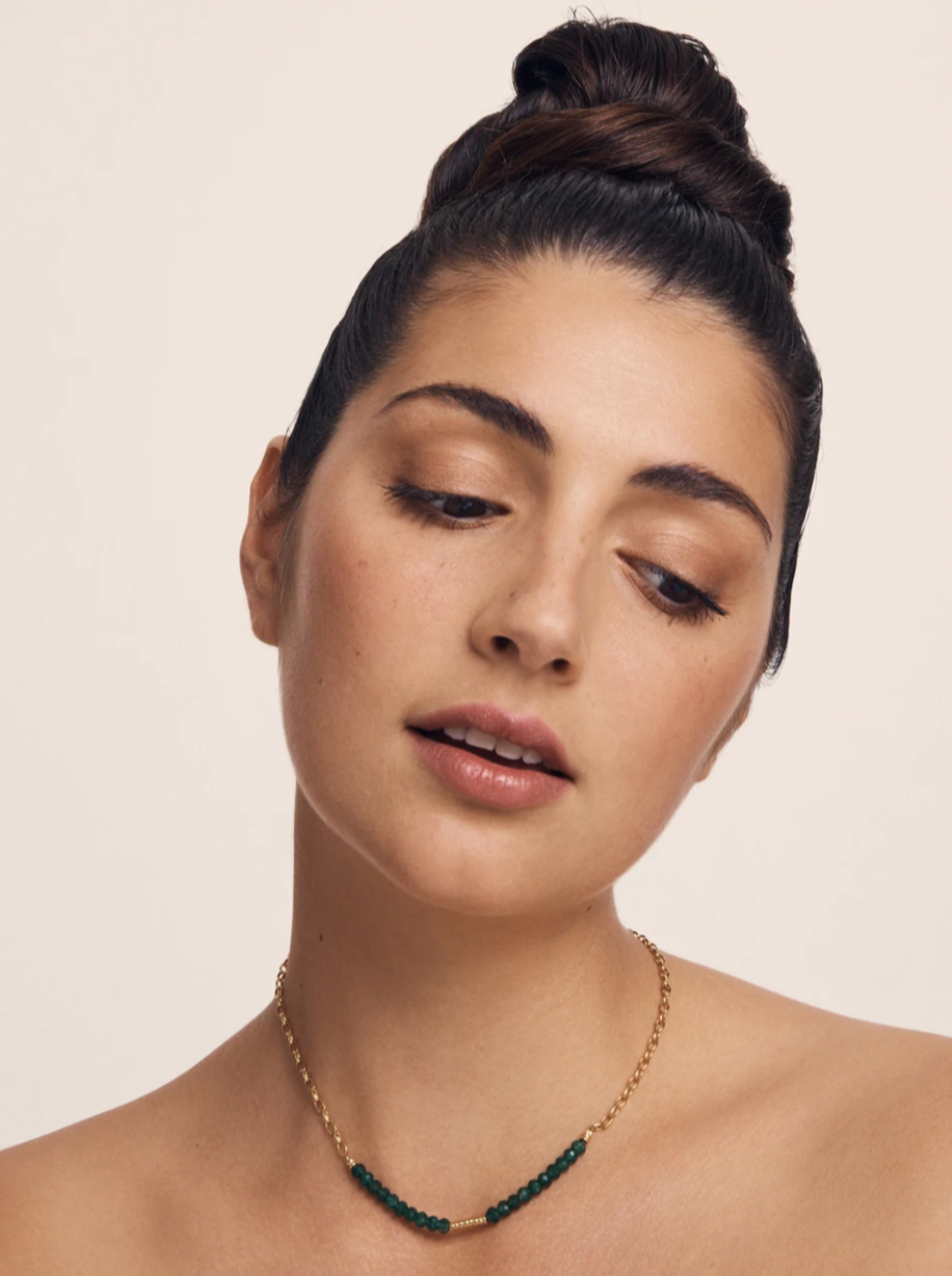 The Rhodes Necklace, in Polished Gold 18K Gold Vermeil, deep green, faceted Aventurine beads and oval Rollo chain, speaks to the Island of that name and the mythical sea nymph, Rhodos. Green Aventurine is a gemstone believed to have the power to release old habit patterns so that vital growth can occur. Wear this necklace to invite luck, opportunity and positive change.
