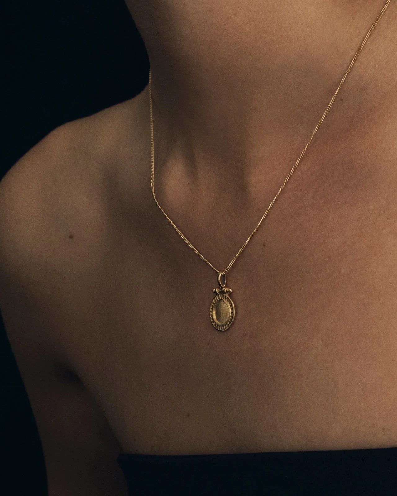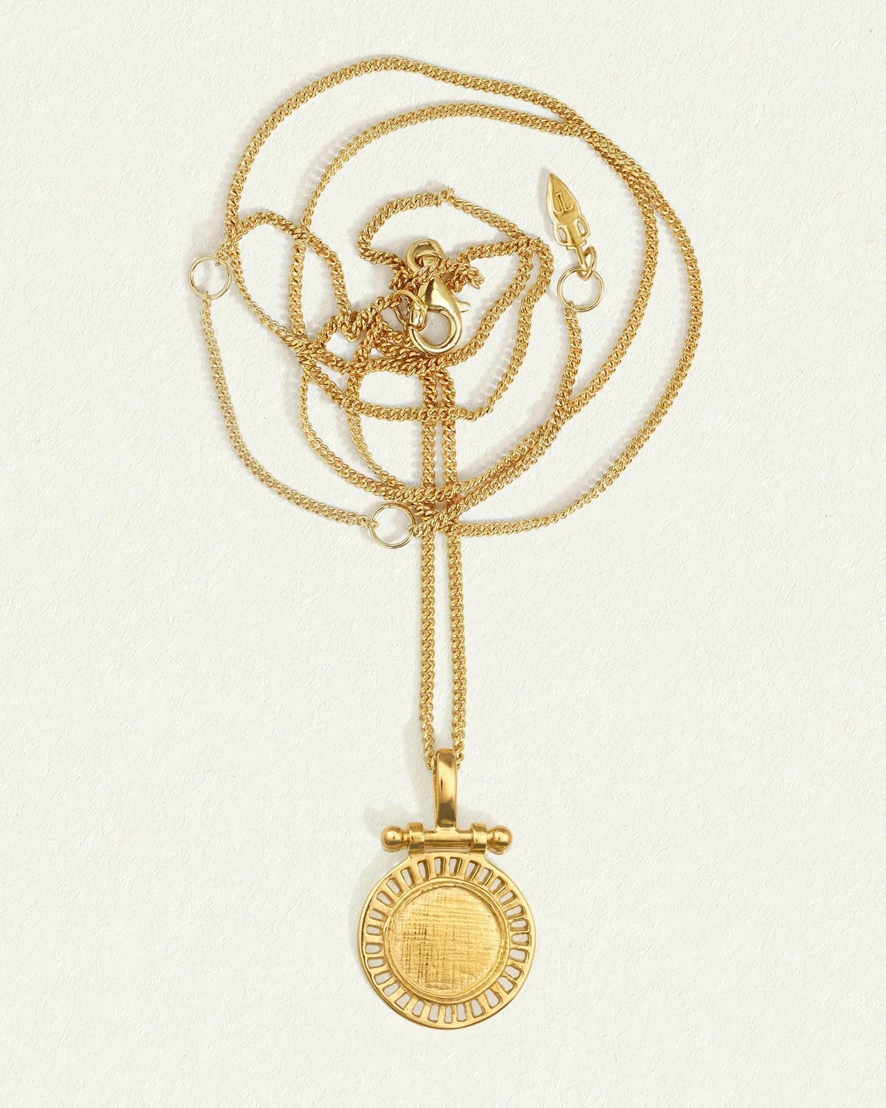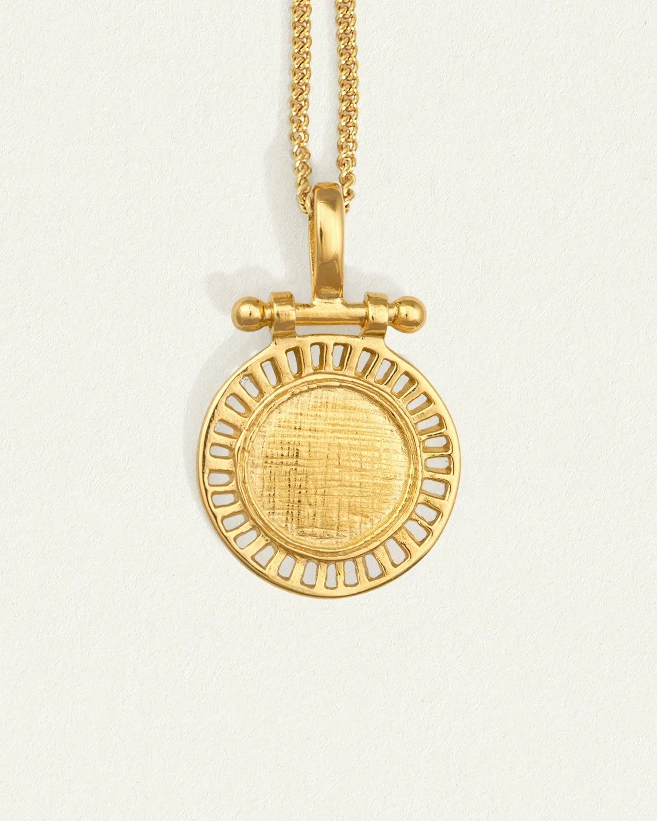Bask in the warmth of the Solar Necklace, crafted from 18k gold vermeil. A twist on the iconic coin necklace, this pendant features a stylised sun crossbrushed to contrast with the polished frame. Our signature Temple rivet and a single curb chain complete this piece