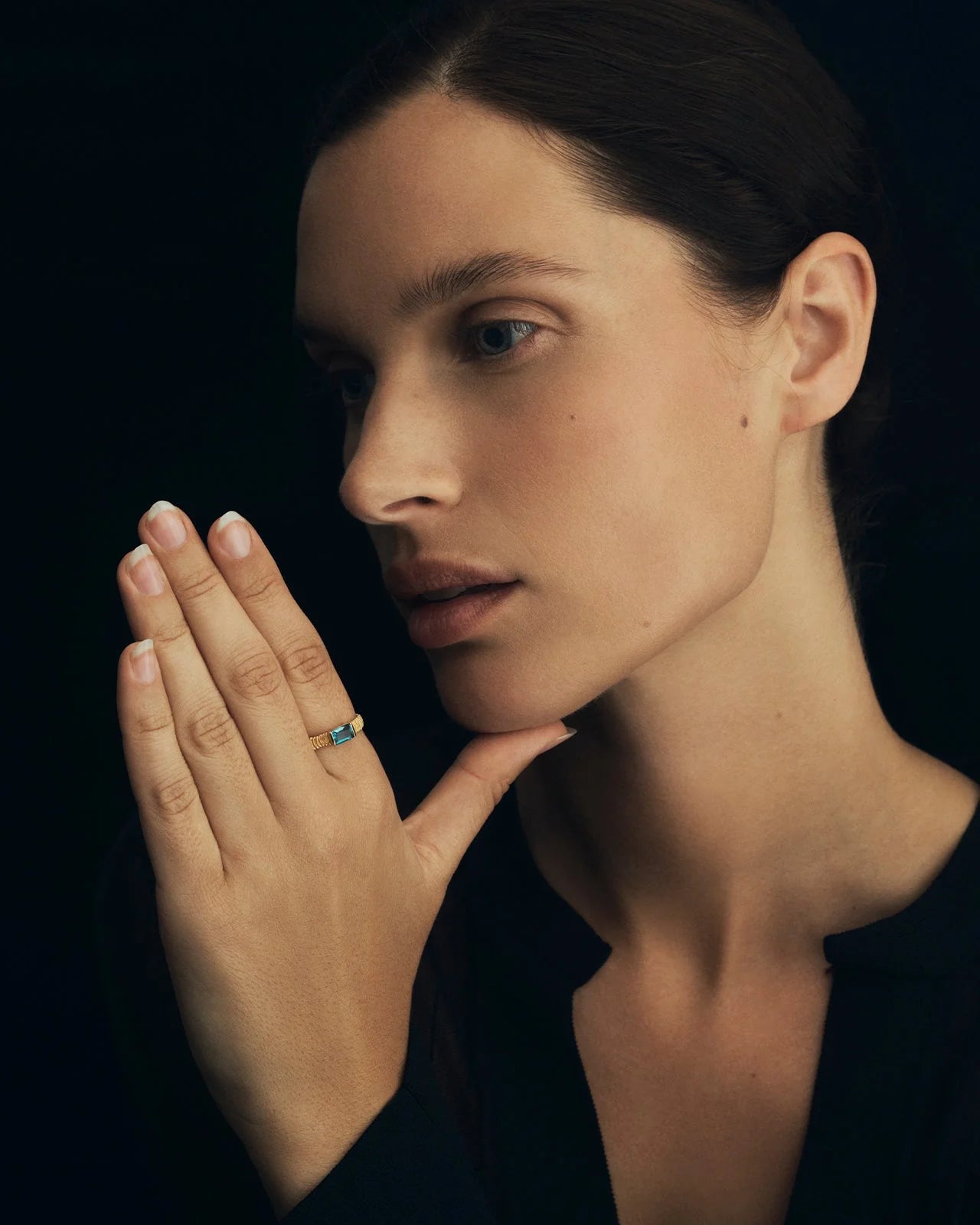 With its ridged band of 18k gold vermeil and baguette-cut London blue topaz, this solitaire dress ring is inspired by the sparkling blue waters and rugged coastline of its island namesake.