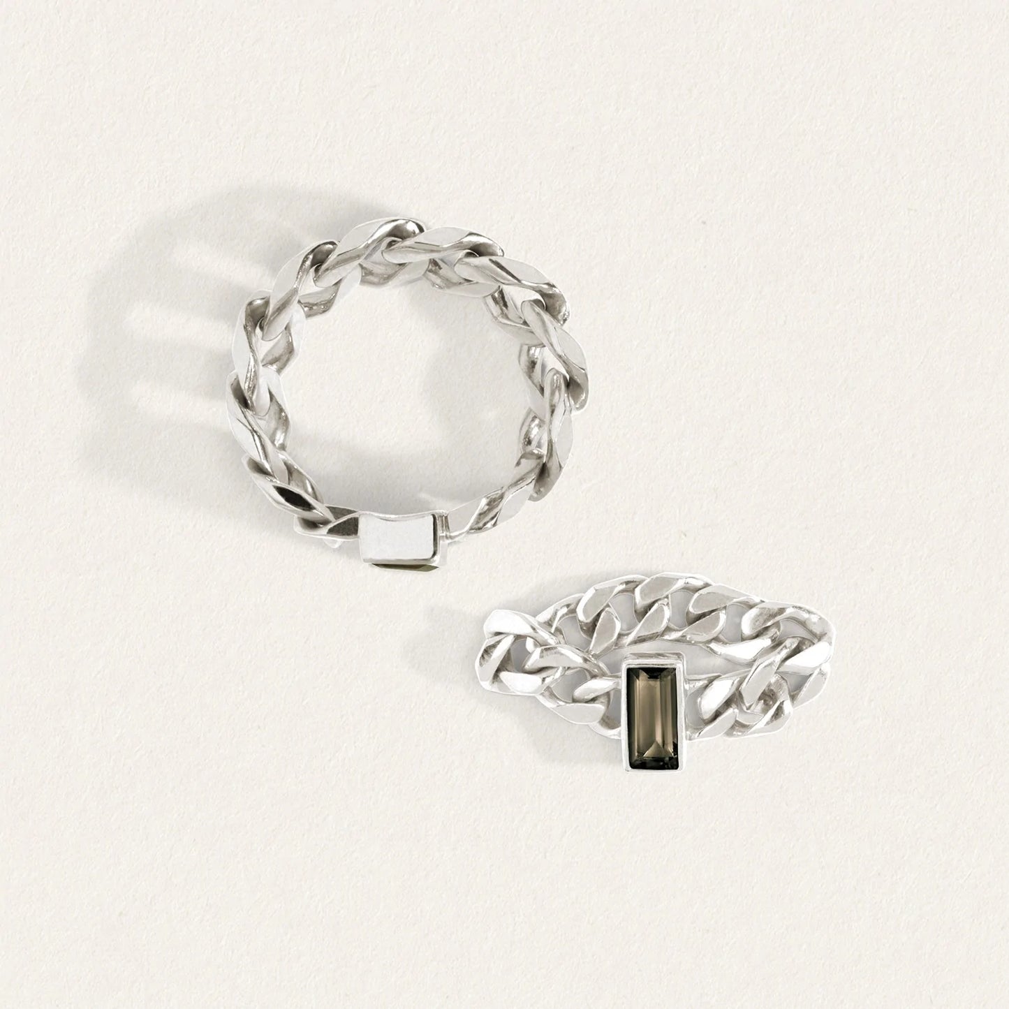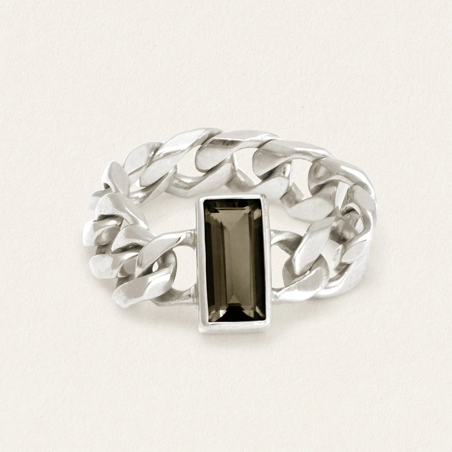 The Tigris Chain Ring features a commanding baguette-cut Smoky Quartz set north-south along a flexible band of ethical 925 Sterling Silver. The robust fluidity of the curb chain pays homage to its namesake, the Tigris River, whose fertile flood banks facilitated the cultural revolution of the early Mesopotamian empires.