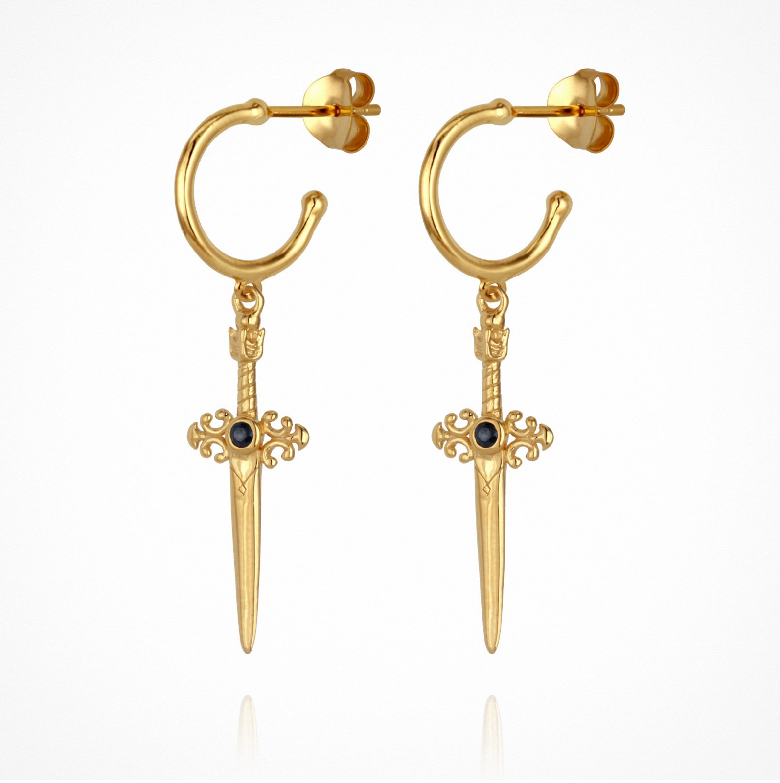 In ancient cultural ceremonies, the sword was a symbol of protection and bravery, representing courage when we need to call upon it most. The Themis Earring, in polished 18k Gold Vermeil, has swords that elegantly hang from hoops and a black Sapphire to centre this symbolic piece. The metaphysical properties of the black Sapphire are said to bring the wisdom of confidence in one’s own intuition, offering protection whilst keeping one grounded and centred in one’s personal power during chaotic situations. The Themis Earring holds the passion of the dagger that pierces through the wall of fear holding us back.